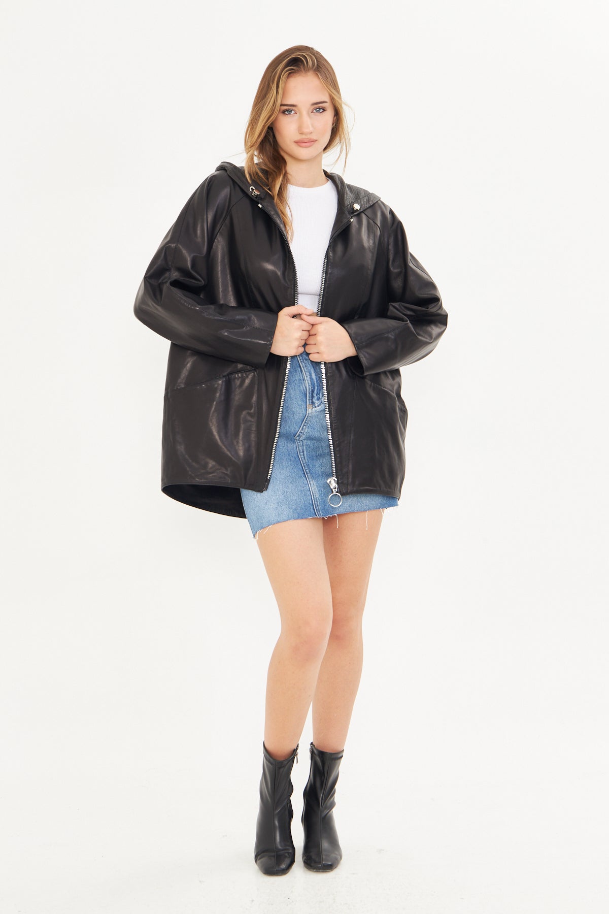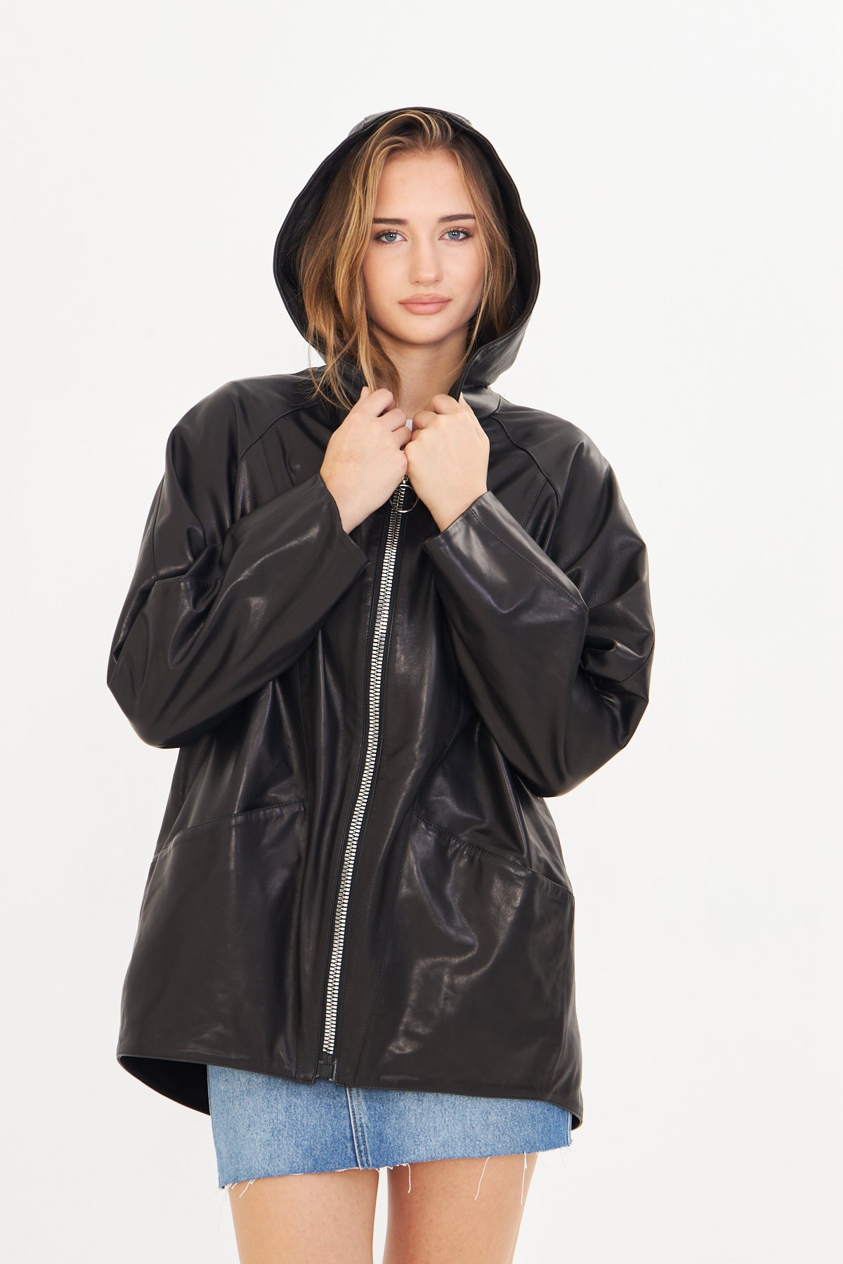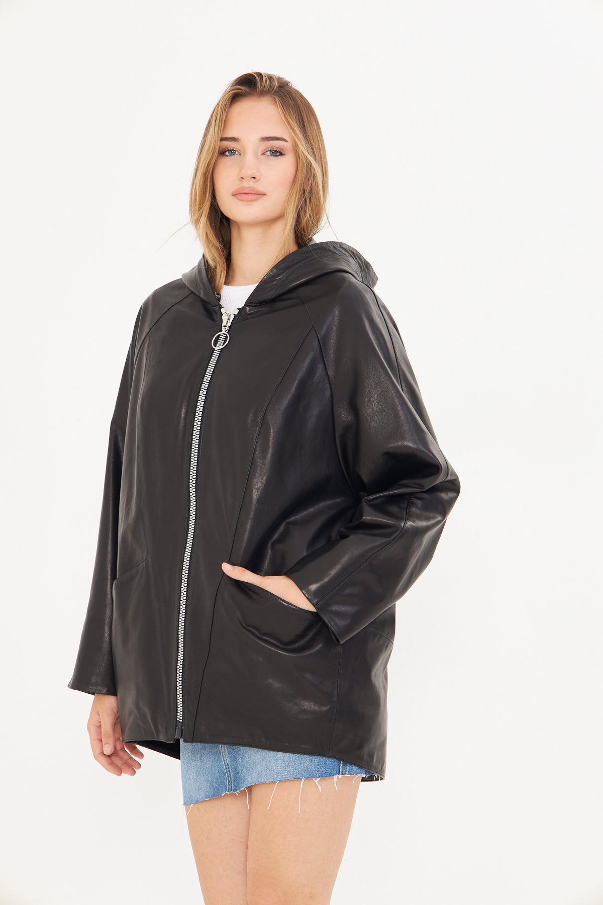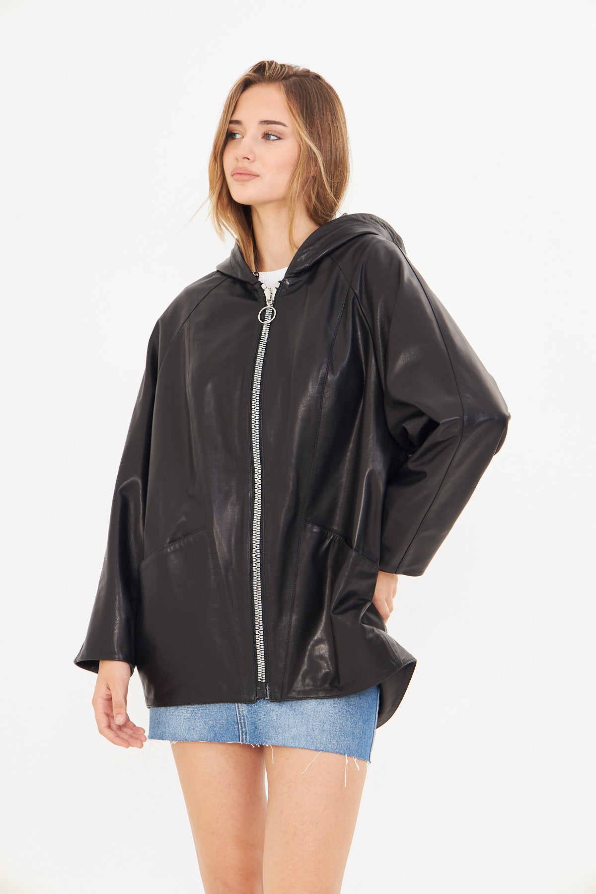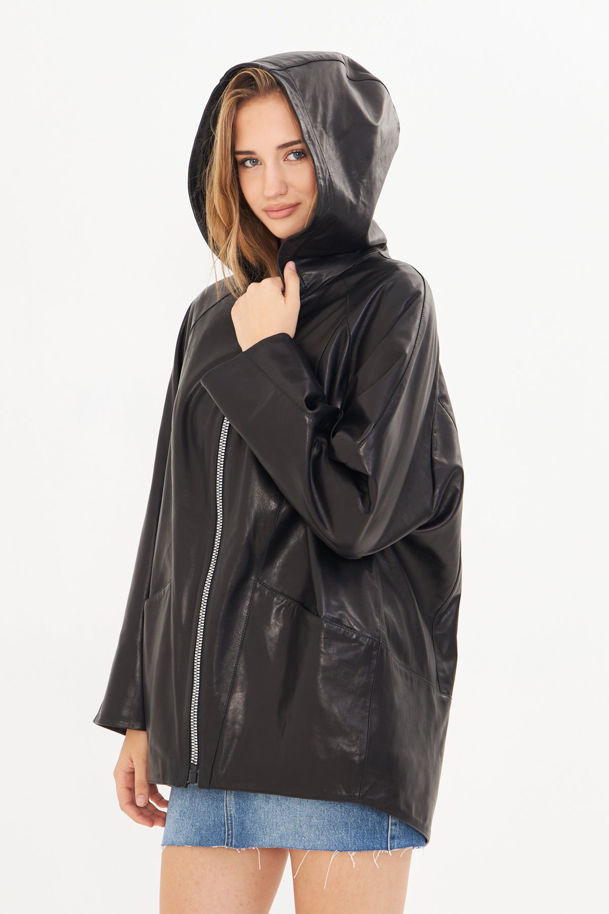 Kadın Kapüşonlu Deri Ceket